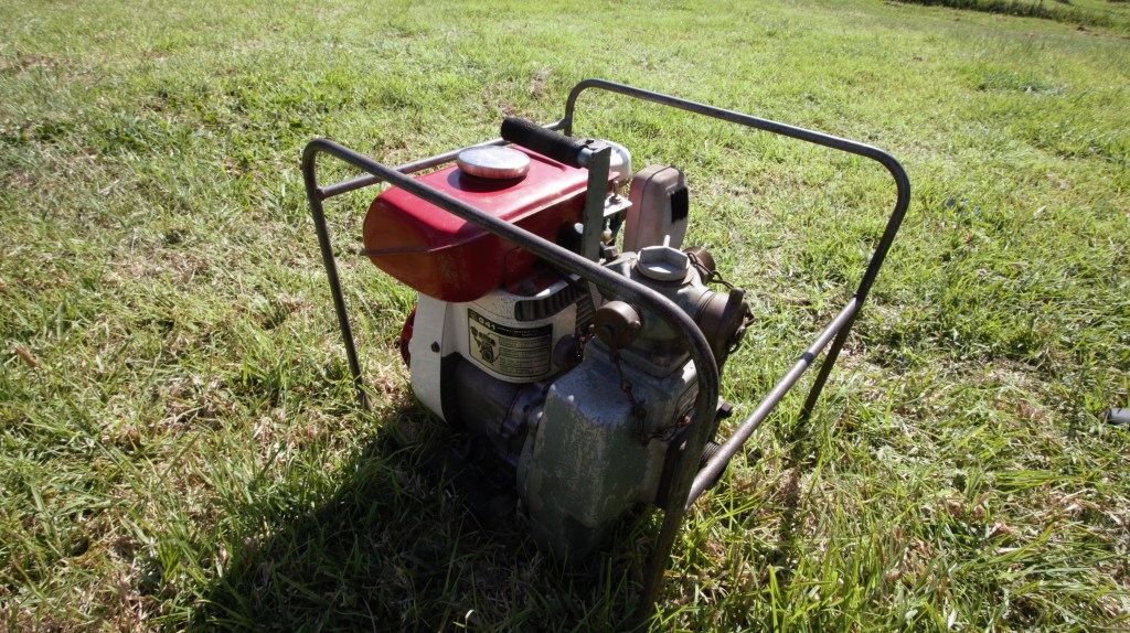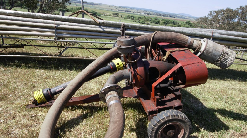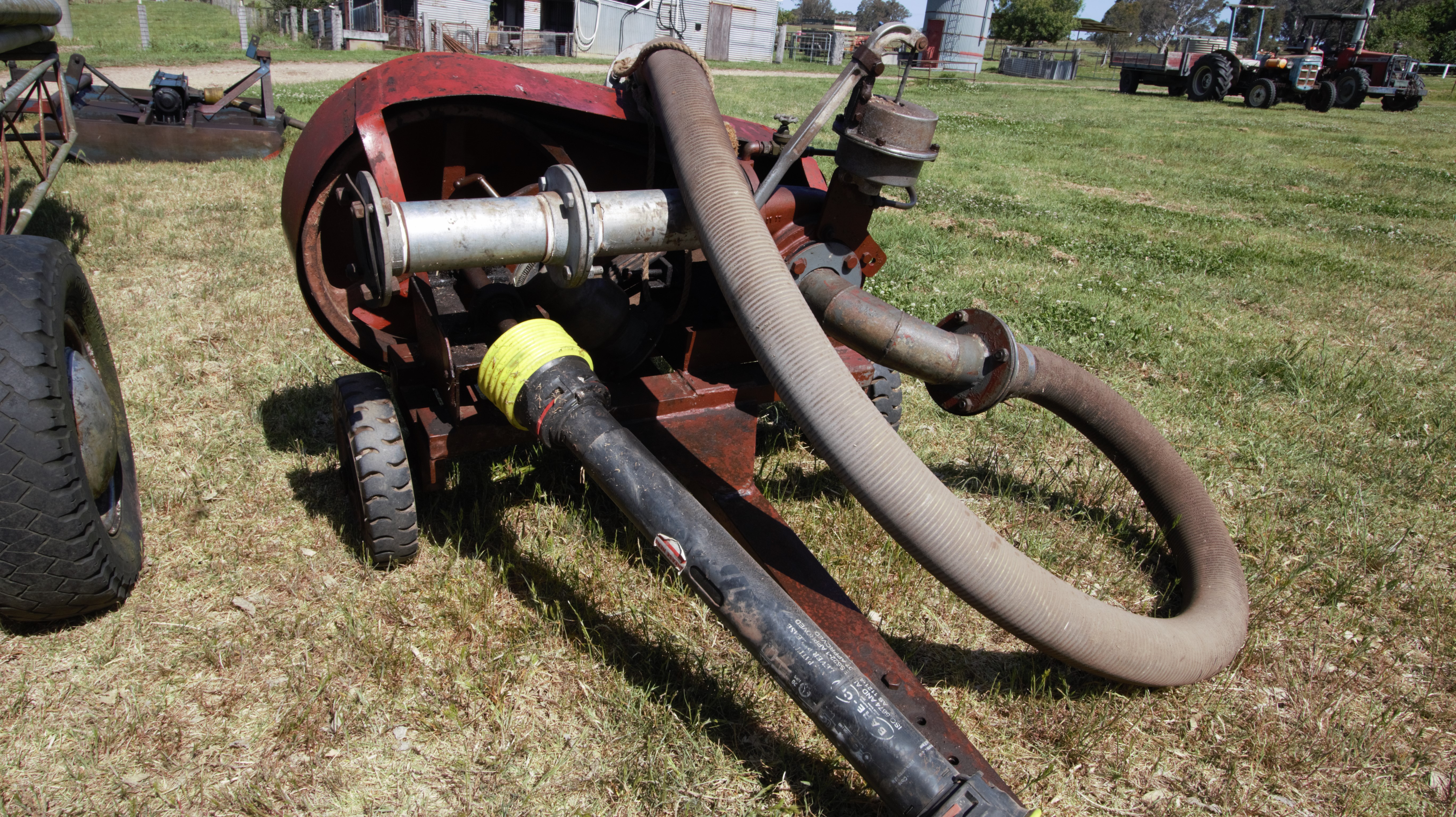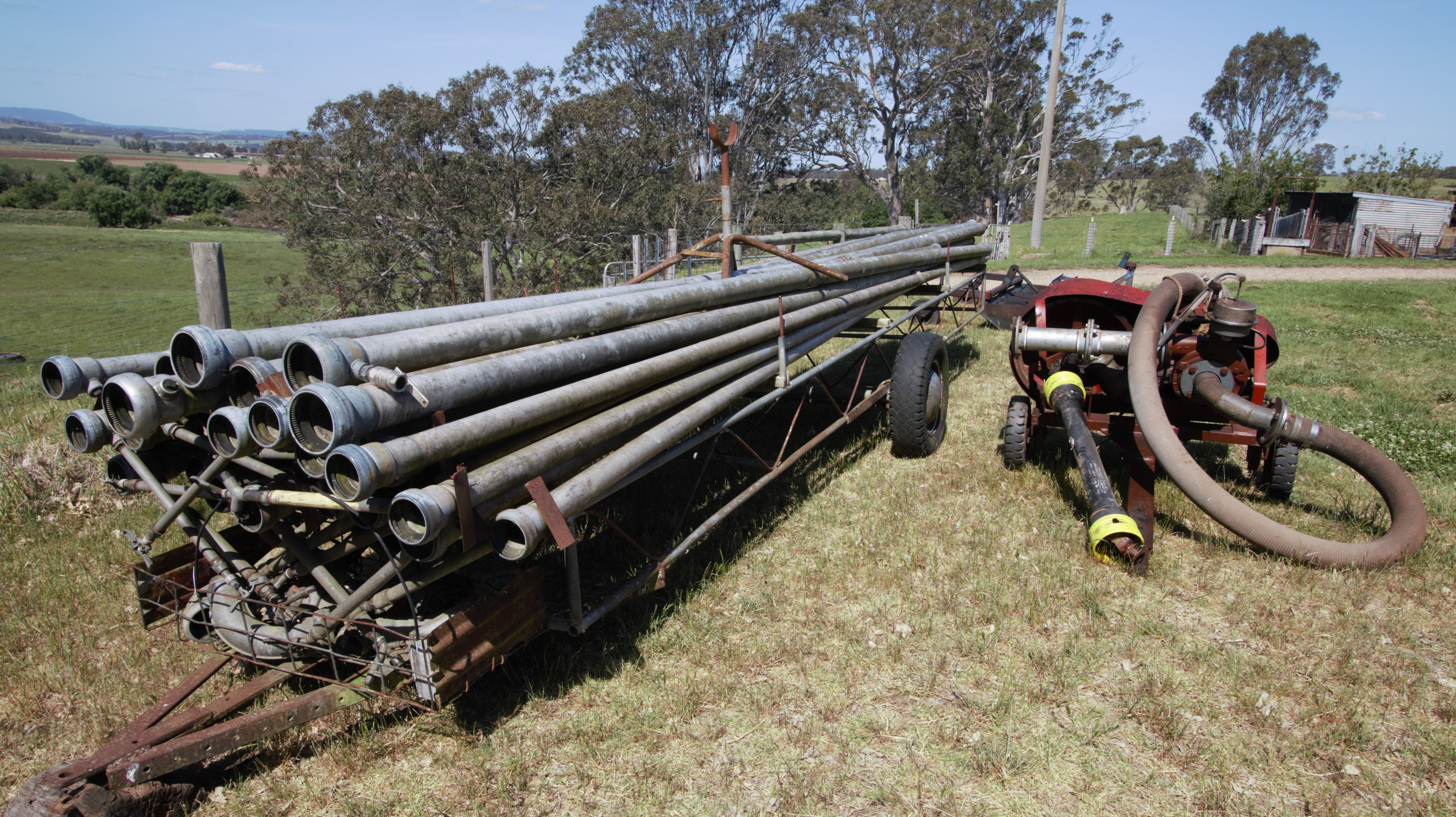 Spray irrigation plant, portable pto, pipes on trailer
