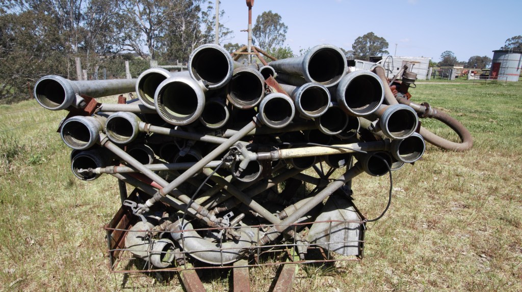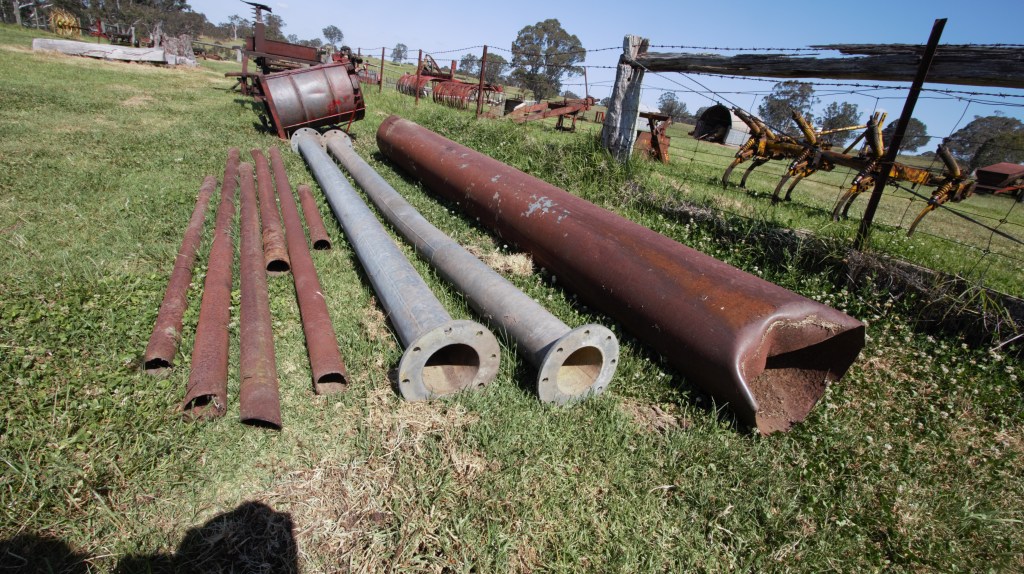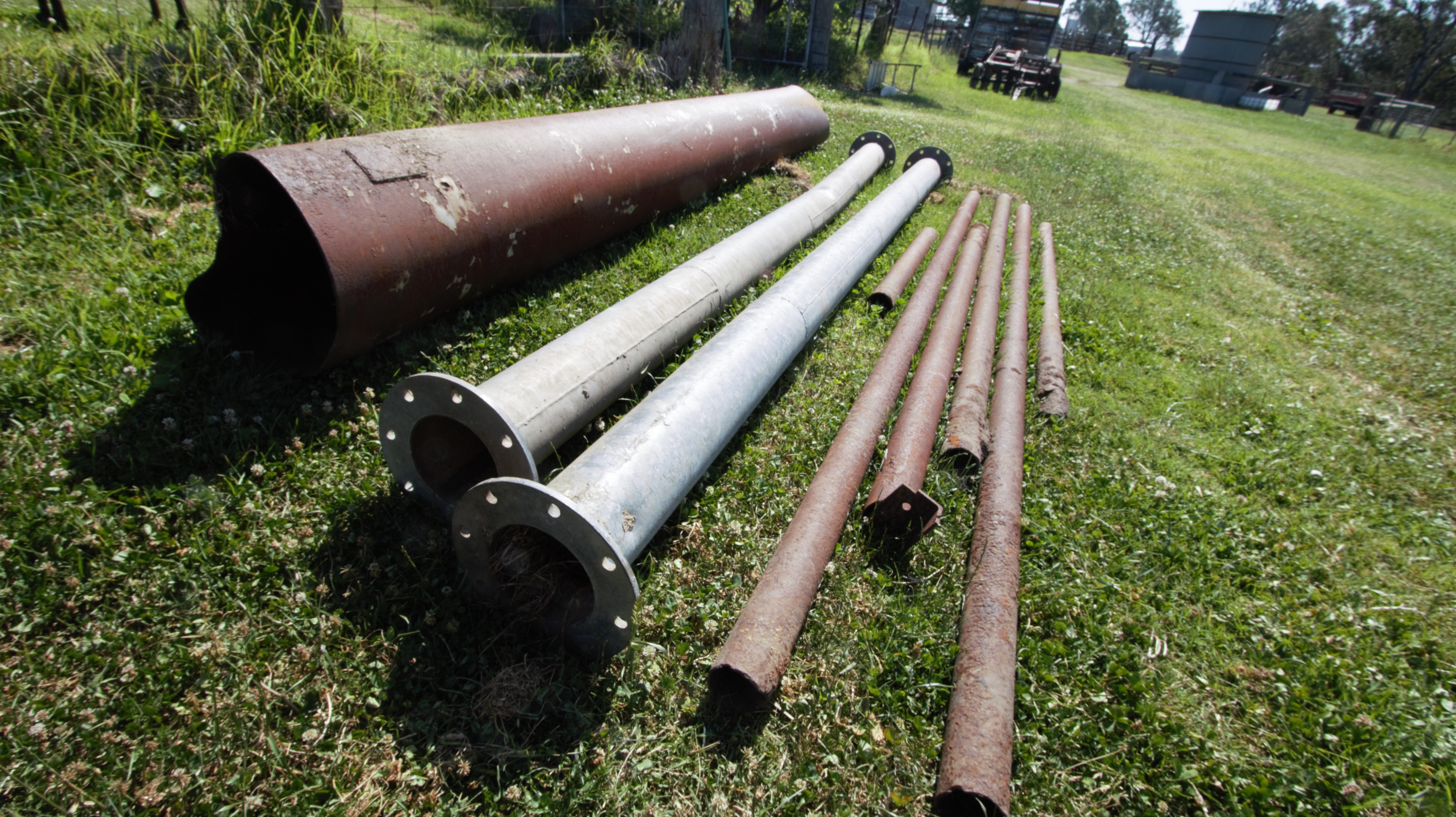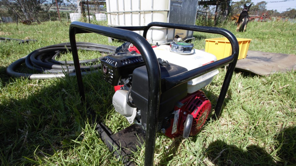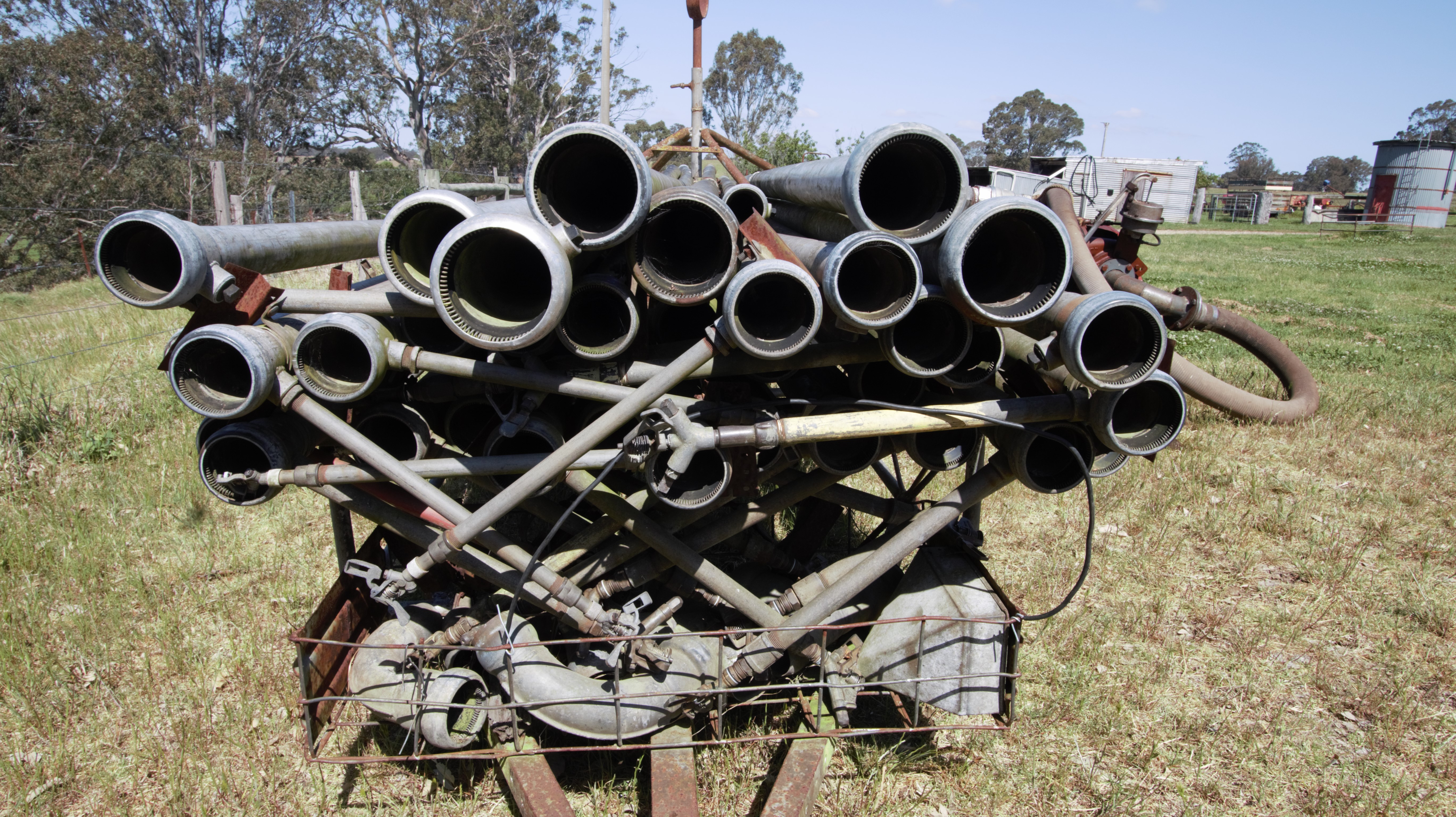 Spray irrigation plant, portable pto, pipes on trailer